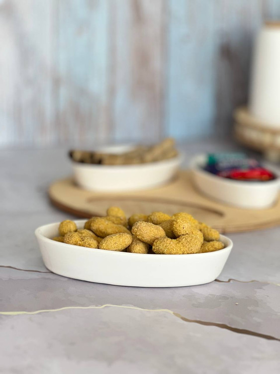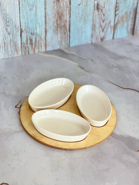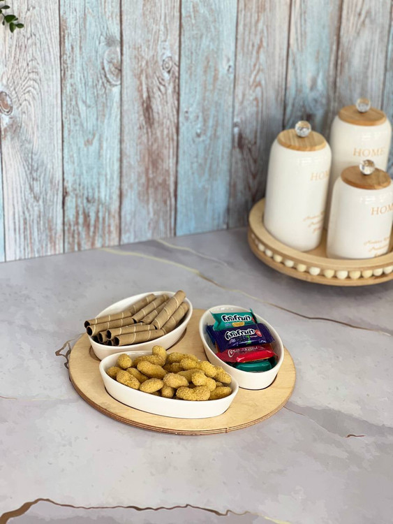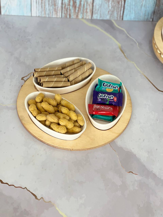 این اردوخوری ۳ خانه با استند گرد چوبی و کاسههای بیضی سرامیکی، انتخابی شیک برای سرو شکلات، آجیل، شیرینی یا تنقلات موردعلاقهتونه 🤍