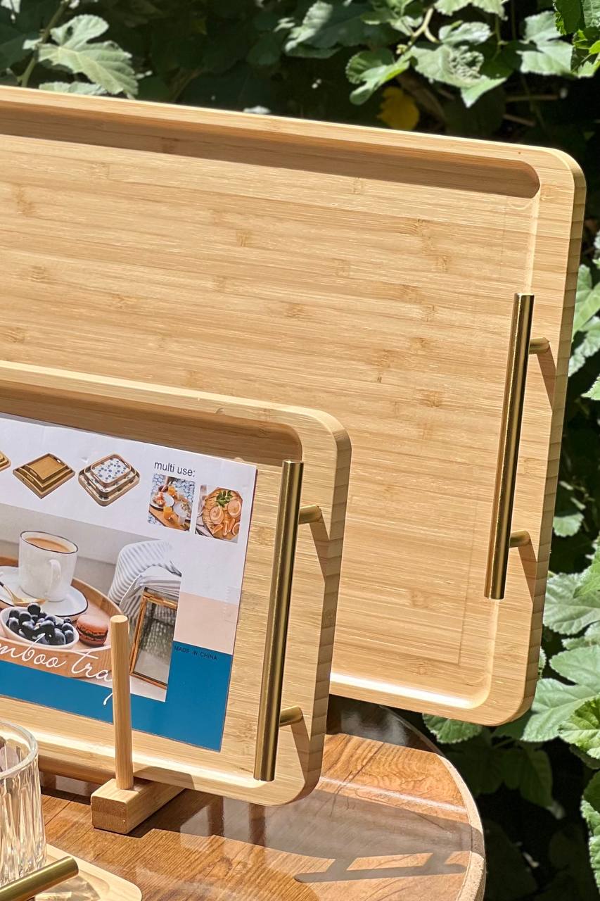 سینی پذیرایی چوبی بامبو | ۳ تکه با دسته طلایی